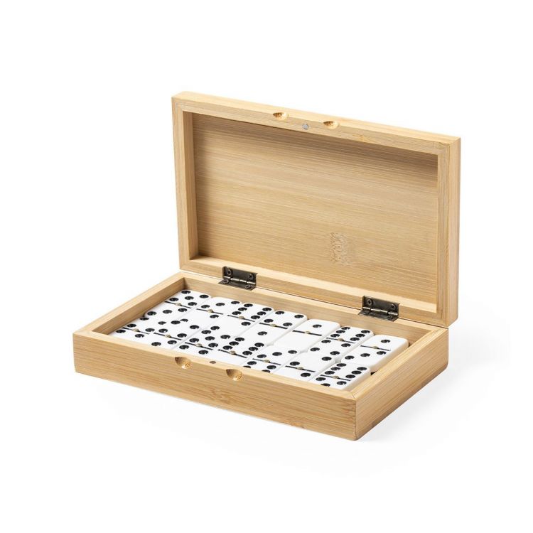 Set Domino classico da 28 pezzi in melamina resistente. Presentato in una custodia individuale in bambù laccato con chiusura magnetica. Confezionato in un'attraente scatola dal design ecologico. (colore naturale)