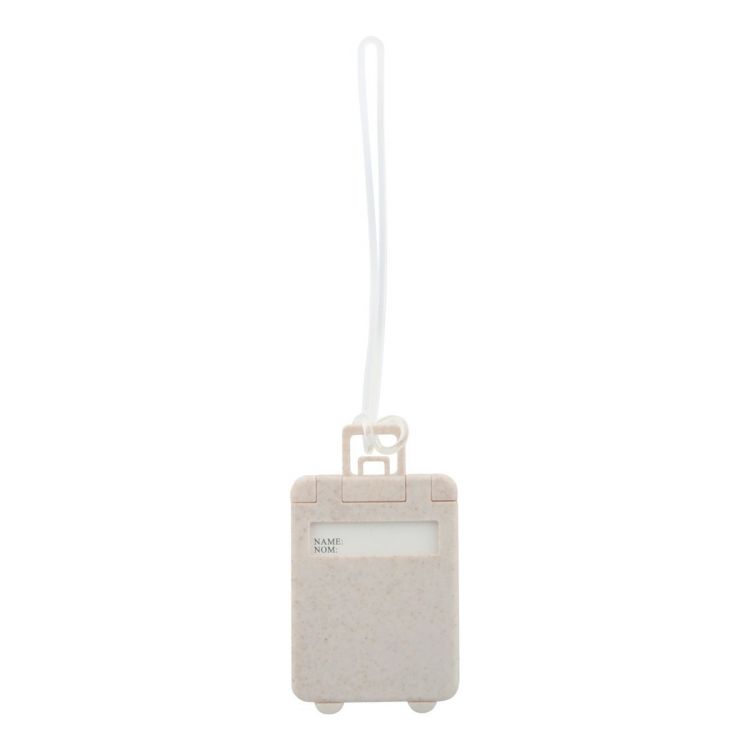 Etichetta per bagagli in plastica ecologica di paglia di grano a forma di trolley con cinghia elastica.