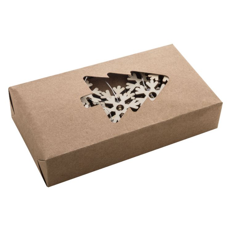Decorazione natalizia luminosa con 20 luci LED a forma di fiocco di neve in legno. Funziona con 2 batterie AA (non fornite), pulsante ON/OFF posizionato sulla custodia delle batterie e confezione in scatola di cartoncino kraft, in colore naturale