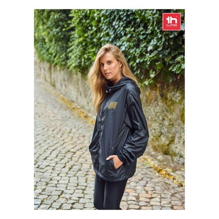 Giacca a vento impermeabile (Unisex) in tessuto taffetà di nylon riciclato al 100% (65 g/m²). Apertura frontale con cerniera YKK® - un marchio che utilizza attrezzature moderne e un elevato controllo di qualità. Il cappuccio è foderato in rete e ha coulisse per stringerlo. Ha occhielli per facilitare la ventilazione, chiusura elastica con stopper sul fondo e tasche laterali con zip