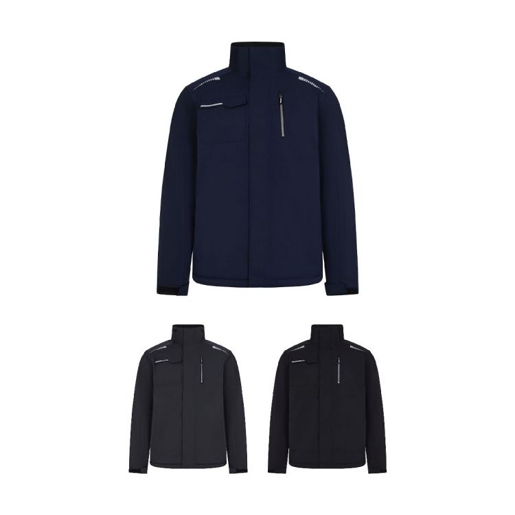 Giacca imbottita (180 g/m²), realizzata in poliestere riciclato (50%) e poliestere (50%). Presenta tessuto elasticizzato idrorepellente, cuciture termosaldate, dettagli riflettenti e chiusura centrale con zip. La giacca ha bottoni nascosti e cinque tasche (2 tasche laterali, 1 tasca sul petto a sinistra, 1 tasca sul petto a destra e 1 tasca interna)