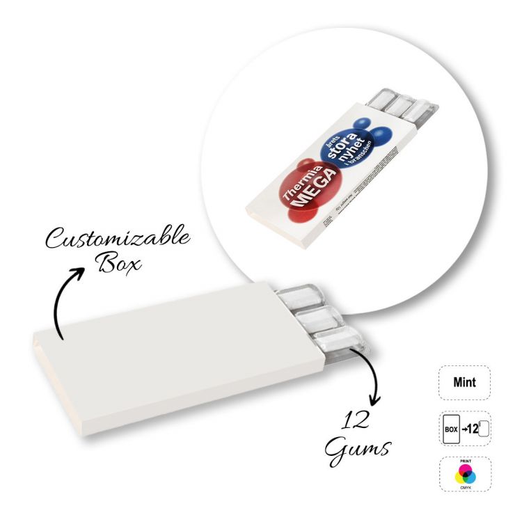 Confezione di 12 gomme da masticare SENZA ZUCCHERO alla menta. Confezione: blister di plastica e la scatola di carta totalmente personalizzabile (finitura della carta: bianca o kraft, a scelta in fase d'ordine). Data di durata minima - 12 mesi.