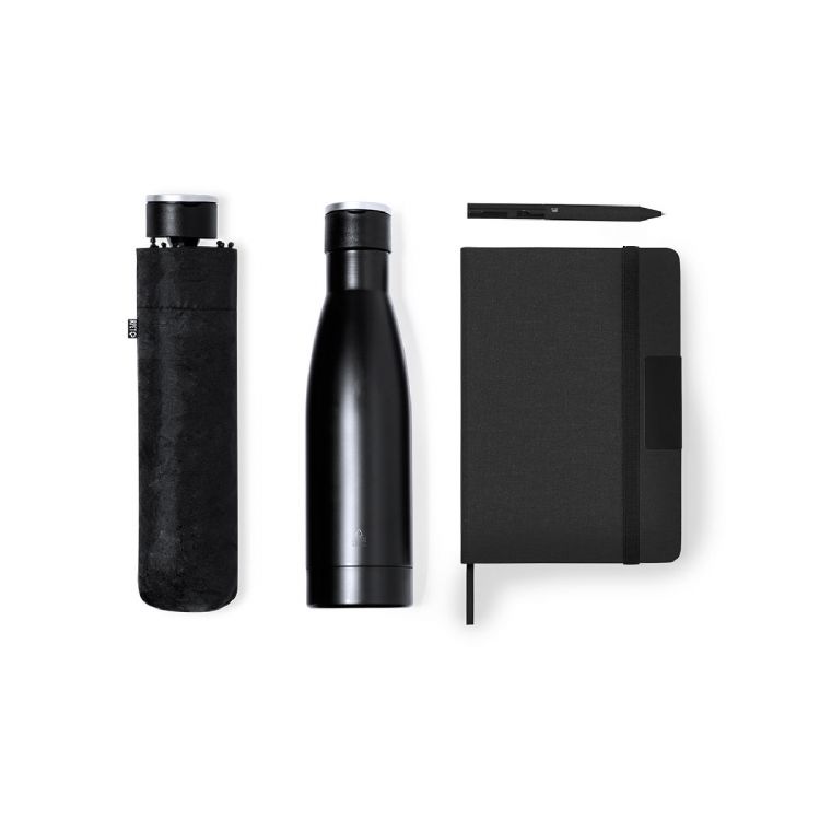 Elegante set premium composto da:Thermos a doppio parete in acciaio inox riciclato con finitura nera opaca e capacità di 500 ml, con maniglia rigida in metallo color argento opaco. Con etichetta acciaio inoxBlock notes in RPET in elegante nero, con speciale dettaglio in metallo per la stampa laser. Include chiusura elastica e segnalibro in tessuto. All'interno 80 fogli con layout a righe. Con logo RPETOmbrello pieghevole nero con diametro di 98 cm. Realizzato in materiale pongee 190T RPET. Apertura manuale, con sistema antivento e stecche in fibra di vetro. Con custodia per il trasporto e nastri coordinati. Con etichetta distintiva RPET.Penna in RPET con finitura nera opaca, meccanismo di rotazione e inchiostro blu. Presentato in una custodia individuale con finitura opaca e fustellatura interna per ogni elemento del set.Il materiale RPET è ottenuto da plastica riciclata, promuovendo così il riutilizzo dei rifiuti plastici e contribuendo alla sostenibilità del pianeta. (colore nero)