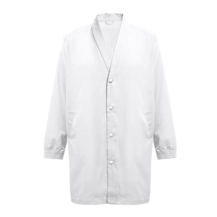 Grembiule da lavoro (unisex) in 20% cotone e 80% poliestere (190 g/m²). Taglio elegante e moderno, girocollo stilizzato con 2 tasche laterali. Polsini elasticizzati e abbottonatura automática a pressione. Apertura posteriore per una maggiore libertà di movimento, in colore bianco, taglia M