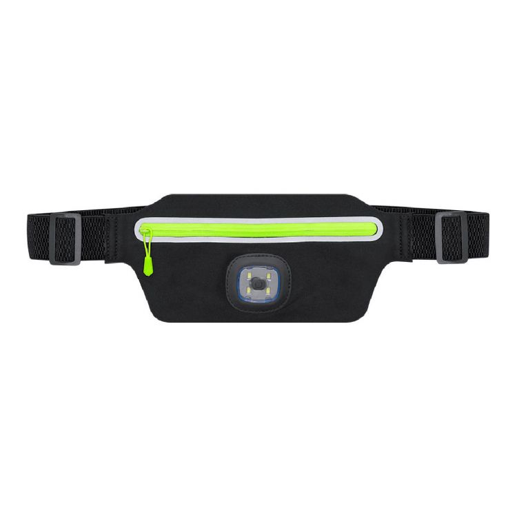 Marsupio realizzato in poliestere resistente. Scomparto principale con chiusura riflettente con cerniera riflettente. Sul davanti include una torcia con 3 intensità luminose. Batteria da 300mAh, con ricarica tramite cavo USB. Con chiusura a fibbia e cinghia regolabile, appositamente progettata per attività sportive e di tempo libero. (colore nero)