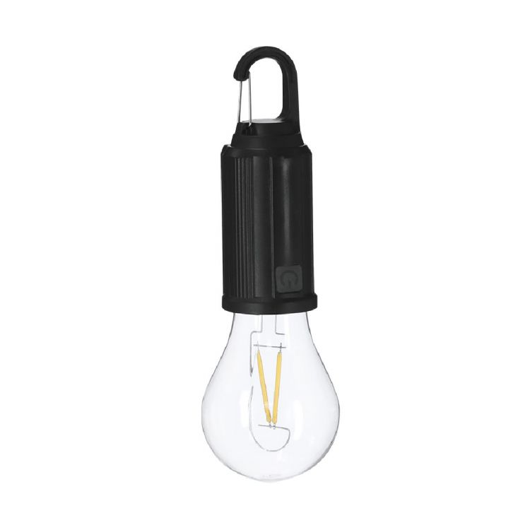 Lampada con design originale della lampadina e corpo in ABS. Batteria da 300 mAh e ricarica solare. Ha un sensore notturno che si attiva automaticamente quando non riceve la luce solare. Dispone di carica tramite cavo di tipo C, oltre a includere un moschettone per un facile trasporto. (colore nero)
