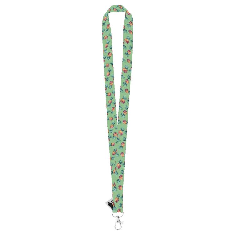 Lanyard in RPET personalizzabile, con moschettone in metallo, stampa in sublimazione su entrambi i lati. MOQ: 100pz