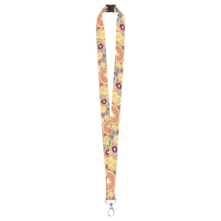 Lanyard in poliestere con moschettone in metallo e fibbia di sicurezza. Con grafica in sublimazione stampata su entrambi i lati. Quantità minima: 100 pezzi