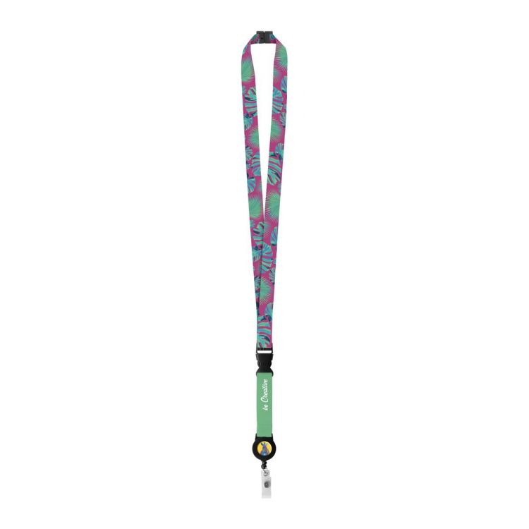 Lanyard in poliestere con porta pass telescopico staccabile e fibbia di sicurezza. Con grafica stampata in sublimazione su entrambi i lati. Prodotto su richiesta. MOQ: 100 pezzi