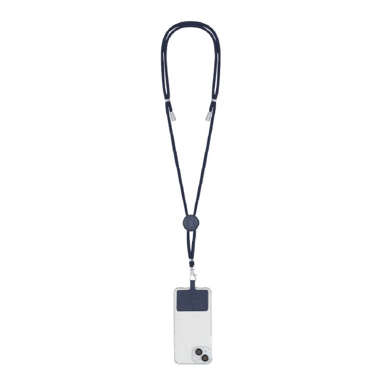 Lanyard con accessorio per smartphone. Realizzato in resistente poliestere. Accessorio di trasporto da posizionare tra la cover e lo smartphone, con moschettone metallico girevole. Regolatori per il collo con dettagli cromati alle estremità dei cordini.