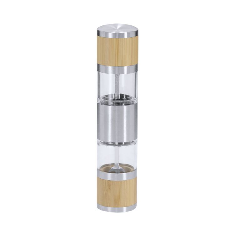 Mozzaffè manuale per sale e pepe fatto di bambù e acciaio inossidabile. Include due scomparti separati per sale e pepe, ciascuno con macinacaffè ceramico interno e regolazione manuale dello spessore. Ha una finestra per vedere il livello. (colore argento)