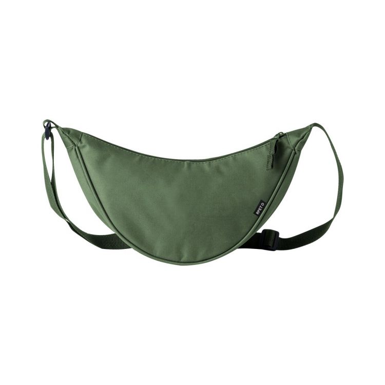 Marsupio a tracolla in poliestere 600D RPET con scomparto principale chiuso da cerniera ed etichetta RPET.