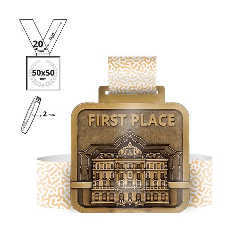 Medaglia quadrata con incluso un lanyard totalmente personalizzabile 20x900 mm. La medaglia viene realizzata con un stampo effetto 3D creato appositamente sul progetto del cliente. Grazie a questa lavorazione possiamo ottenere un prodotto unico e tridimensionale, fuso all'interno dello stampo. Le medaglie sono disponibili con tre finiture base (oro, argento e bronzo) allo stesso prezzo.