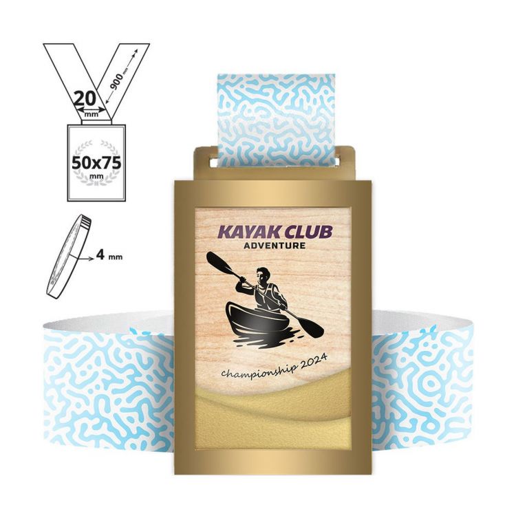 Medaglia rettangolare realizzata in due materiali combinati composta da: bordo in acciaio largo 8 mm e l'interno in compensato, stampata full color sul fronte , e con incluso un lanyard totalmente personalizzabile 20x900mm. Grazie alla speciale lavorazione taglio laser e stampa UV full color su tutta la superfice, possiamo realizzare qualsiasi personalizzazione richiesta dal cliente.