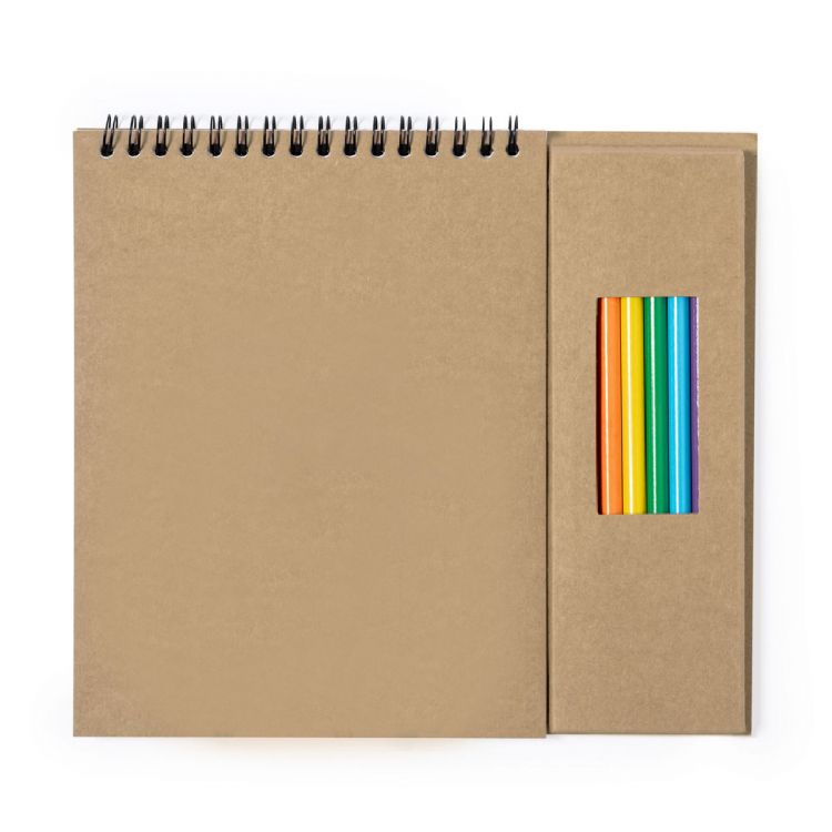 Fantastico set di matite e quaderni in cartone riciclato. Contiene un astuccio finestrato con 8 matite con fusto esagonale in vari colori e un quaderno ad anelli con 6 fogli di motivi naturali e 18 pagine bianche. (colore naturale)