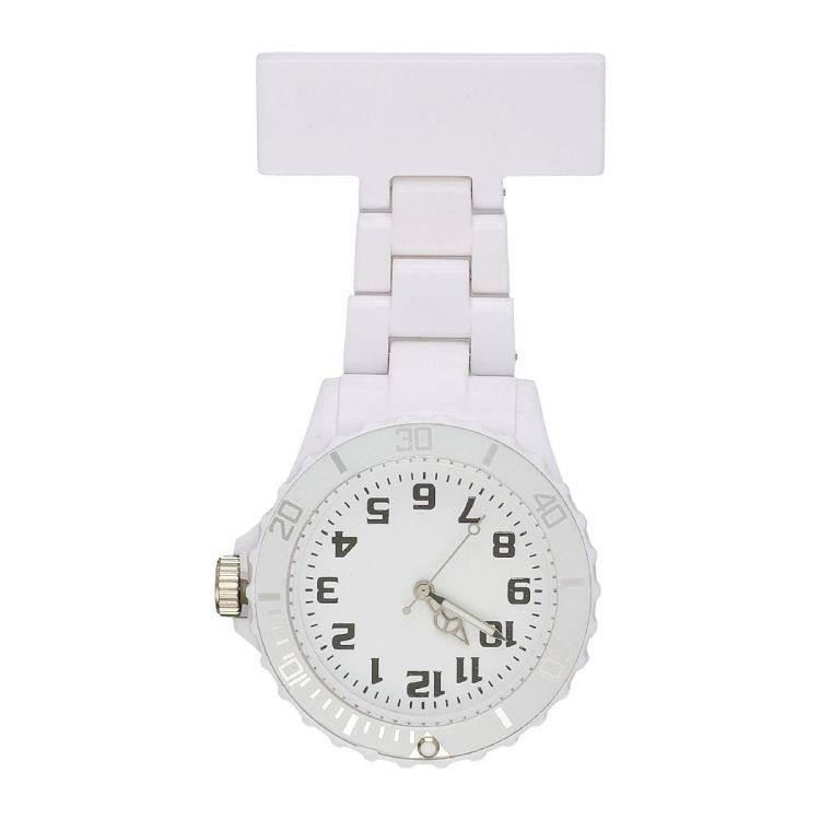 Orologio da infermiera, numerazione colorata in argento e bianco sul quadrante e sull'anello esterno, placca rettangolare con spilla di sicurezza, in ABS, in colore bianco