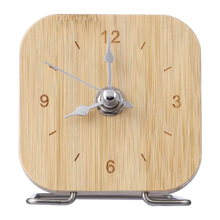 Orologio in bambù, dispone di lancette argentate, base d'appoggio, include batteria, confezionato singolarmente in una scatola in cartone avana, in colore marrone