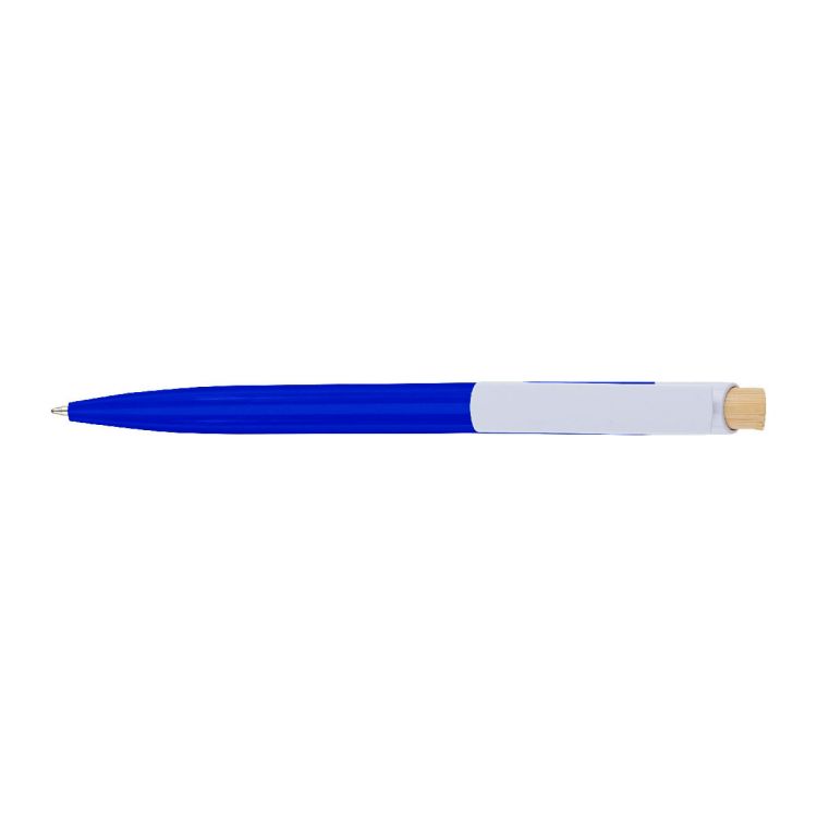 Penna a sfera in ABS riciclato, meccanismo a scatto in bambù e clip bianca, presenta logo materiale "riciclato" integrato nello stampo, lunghezza di scrittura circa 600 metri, refill blu.