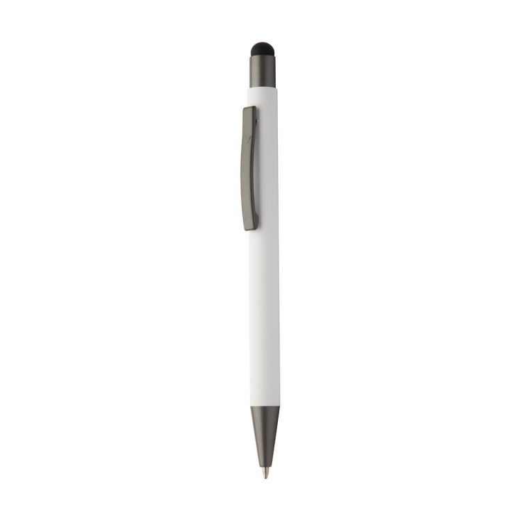 Penna a sfera capacitiva in alluminio riciclato con refill blu, fusto gommato e parti con finitura color canna di fucile.