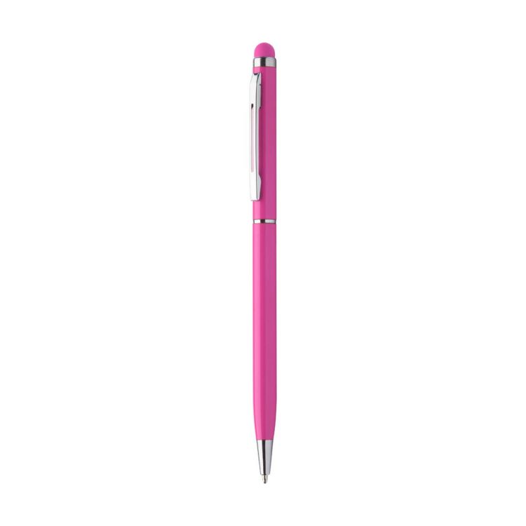 Penna a sfera in alluminio colorato con gommino capacitivo in colore coordinato e refill blu.