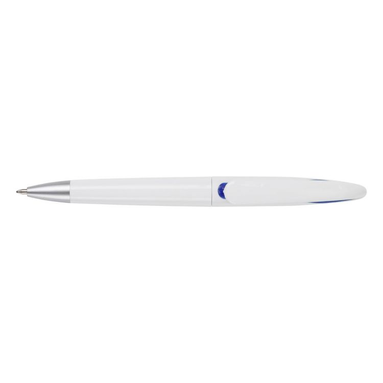 Penna a sfera cigno, corpo bianco, finiture colorate, meccanismo a rotazione, refill nero. Articolo registrato.