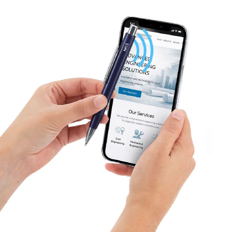 Penna NFC con corpo in alluminio opaco. Pinza argentata abbinata con pulsante e punta. Inchiostro blu. Penna con tag NFC integrato, compatibile con tutti gli smartphone e dispositivi smart con tecnologia NFC. Ti permette di trasmettere le informazioni che desideri in modo rapido e semplice: basta avvicinare il dispositivo alla penna per accedere istantaneamente a link, pagine web, video, social network e molto altro. Una soluzione innovativa che collega il tuo brand con un semplice gesto.