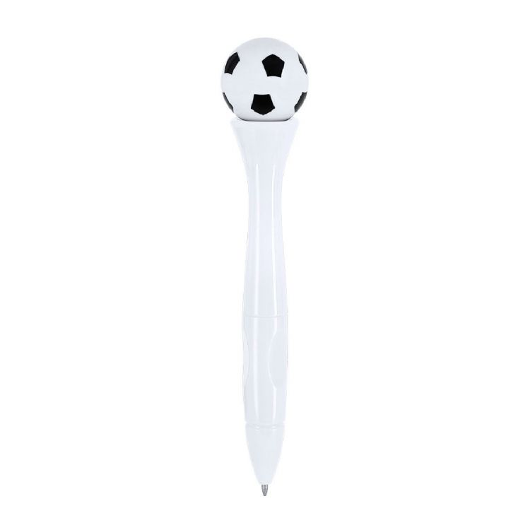 Penna antistress con meccanismo rotante e design per il pallone da calcio. Corpo con finitura lucida e solida. Con inchiostro blu. (colore bianco)