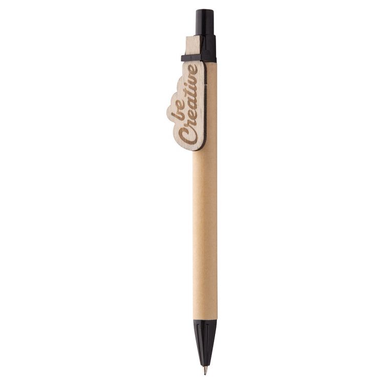 Penna a sfera in carta riciclata con clip in compensato personalizzabile e refill blu. La clip è realizzabile con forma esclusiva - dimensione massima: 25×35 mm. Il costo comprende l'incisione del logo sulla clip. MOQ: 100 pezzi, in colore nero