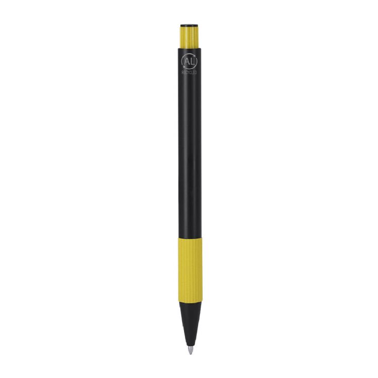 Penna con corpo in alluminio riciclato. Manico con finitura gommosa e texture. Meccanismo a pulsante, cartuccia gigante e inchiostro blu. Include il distintivo in alluminio riciclato.
