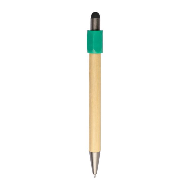 Penna a sfera in bambù con funzione spinner in ABS riciclato e punta stilo nera sul pulsante. Presenta un meccanismo a pressione, pennino da 1,0 mm e refill blu con una lunghezza di scrittura di circa 800 metri. Include un logo in ABS riciclato.