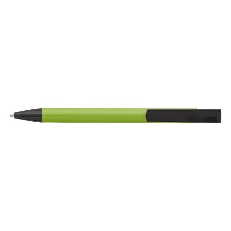 Penna a sfera in alluminio, corpo colorato, finiture in nero, meccanismo a scatto, funzione supporto smartphone, refill blu, in colore lime