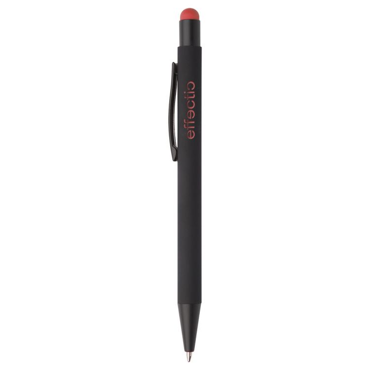 Penna a sfera in alluminio con gommino capacitivo e finitura gommata. Lo speciale rivestimento permette la personalizzazione ad incisione evidenziando il fondo in colore coordinato al gommino. Fornita con refill blu.
