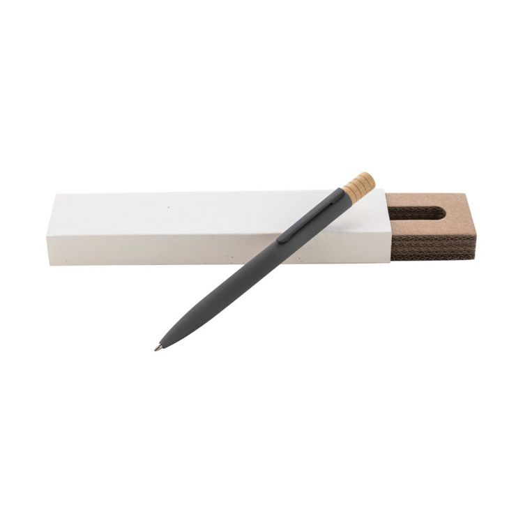 Penna a sfera in alluminio riciclato, meccanismo di apertura a rotazione, fusto gommato, componenti con finitura color canna di fucile e cappuccio in bamboo. Fornita con refill blu ed astuccio in cartoncino kraft