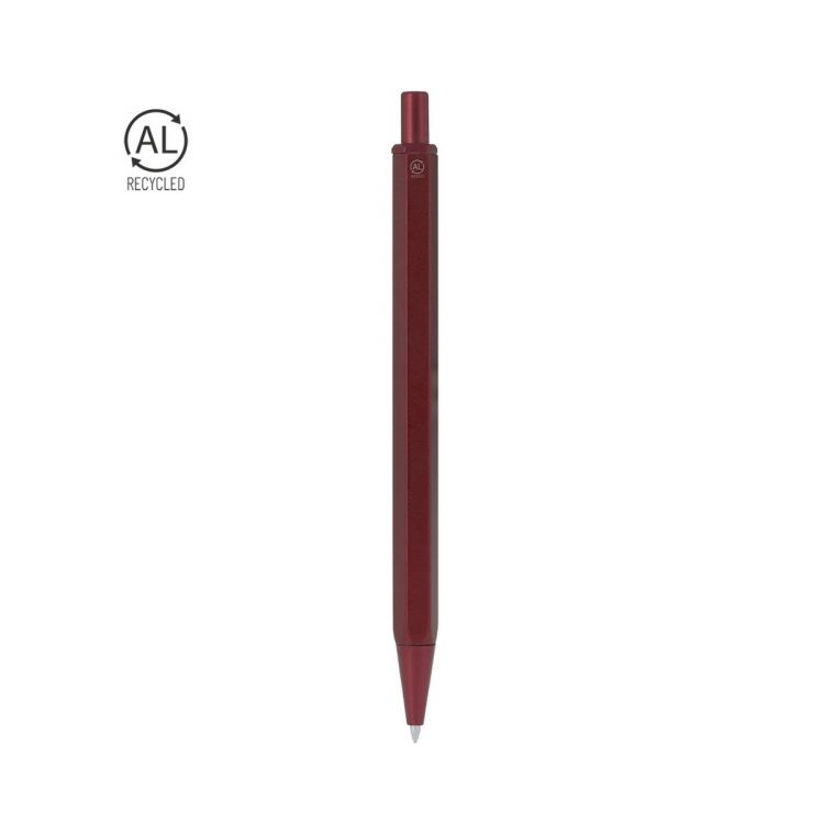 Elegante penna realizzata in Alluminio Riciclato. Corpo con forma esagonale distintiva. Con meccanismo a pulsante realizzato in ABS Riciclato e inchiostro blu. Con logo distintivo di Alluminio Riciclato marcato sulla canna.L'Alluminio Riciclato è un materiale con possibilità di riciclaggio quasi infinite, senza perdere le sue proprietà originali e consumando meno energia in questo processo.Certificazione GRS (Global Recycled Standard / Standard di Riciclaggio Globale), che garantisce l'origine riciclata del materiale utilizzato per fabbricare il prodotto.Il RABS è una plastica altamente riciclabile di grande resistenza e con molteplici applicazioni che lo rendono una soluzione eco-friendly. Con certificazione RCS, che garantisce l'origine riciclata e con logo RABS inciso.
