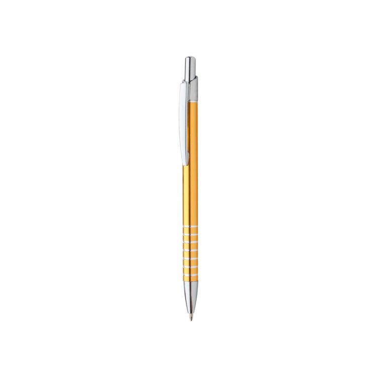 Penna a sfera in alluminio con decorazione incisa ad anelli, clip e puntale cromati, refill blu.