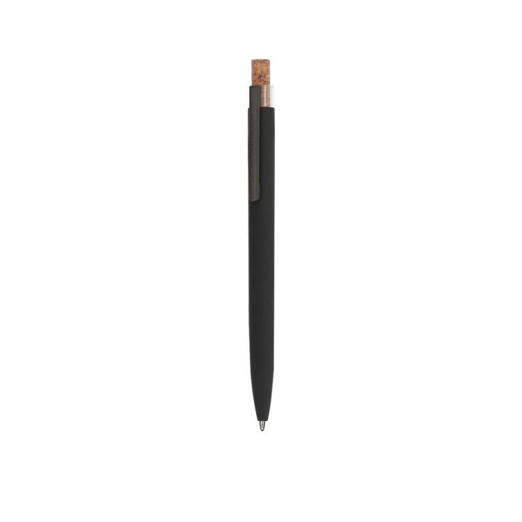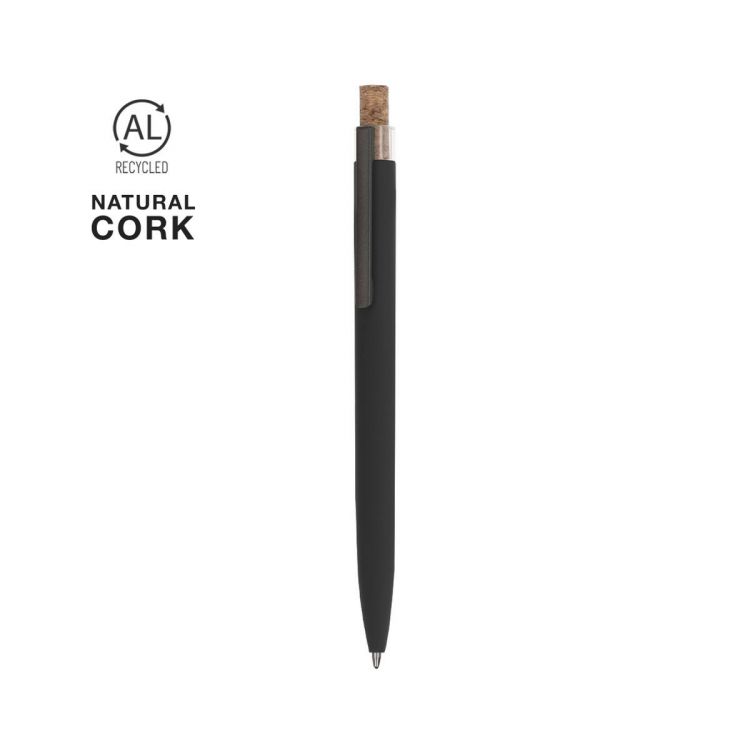 Penna a sfera a meccanismo a pulsante realizzata in alluminio riciclato. Pulsante in sughero e corpo con finitura gomma, progettato specialmente per il marcaggio laser. Clip metallico e distintivo alluminio riciclato nella parte superiore della penna. Con cartuccia jumbo e inchiostro blu. L'alluminio riciclato è un materiale con possibilità di riciclo quasi infinite, senza perdere le sue proprietà originali e consumando meno energia in questo processo.Certificazione GRS (Global Recycled Standard / Standard di Riciclo Globale), che garantisce l'origine riciclata del materiale utilizzato per fabbricare il prodotto.