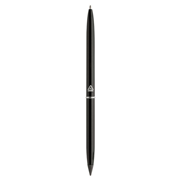 2in1, penna a sfera con meccanismo a rotazione in alluminio riciclato e penna senza inchiostro. Con refill blu e punta in lega metallica che ossida la carta. Questa penna scrive come una matita ed è anche cancellabile.