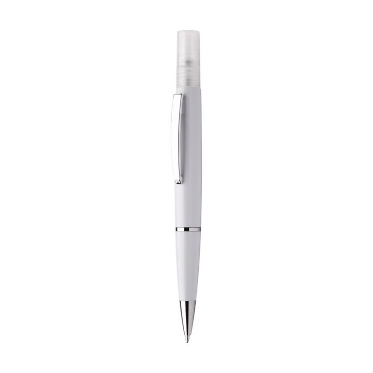Penna a sfera in plastica con refill blu e spray igienizzante sulla parte superiore. Capacità: 3 ml. Fornita senza liquido disinfettante, in colore bianco