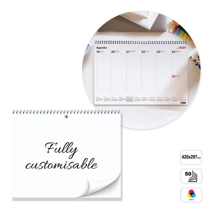 Planning da tavolo orizzontale, totalmente personalizzabile. Il prodotto è composto da 50 fogli di carta usomano da 90 grammi, stampabili fronte o fronte e retro in quadricromia, e copertina in cartoncino da 300 grammi con la finitura pattinata opaca stampabili fronte o fronte e retro in quadricromia. Rilegato con la spirale metallica color argento, bianco o nero, posizionata in cima. Supporto in cartoncino bianco da 300 gr non stampabile. Il planning può essere personalizzato basandosi sul template modificabile fornito, oppure costruito completamente seguendo le linee guida fornite.