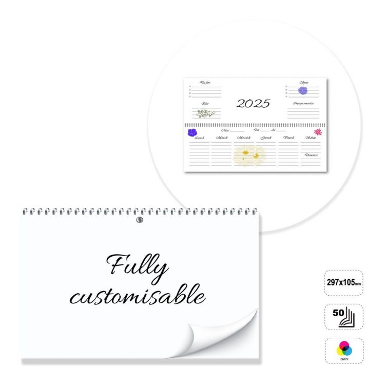 Planning da tavolo orizzontale, totalmente personalizzabile. Il prodotto è composto da 50 fogli di carta usomano da 90 grammi, stampabili fronte o fronte e retro in quadricromia e copertina in cartoncino da 300 grammi con la finitura pattinata opaca stampabili fronte o fronte e retro in quadricromia. Rilegato con la spirale metallica color argento, bianco o nero a scelta, posizionata in cima. Supporto in cartoncino bianco da 300 gr non stampabile. Il planning può essere personalizzato basandosi sul template modificabile fornito, oppure costruito completamente seguendo le linee guida fornite.