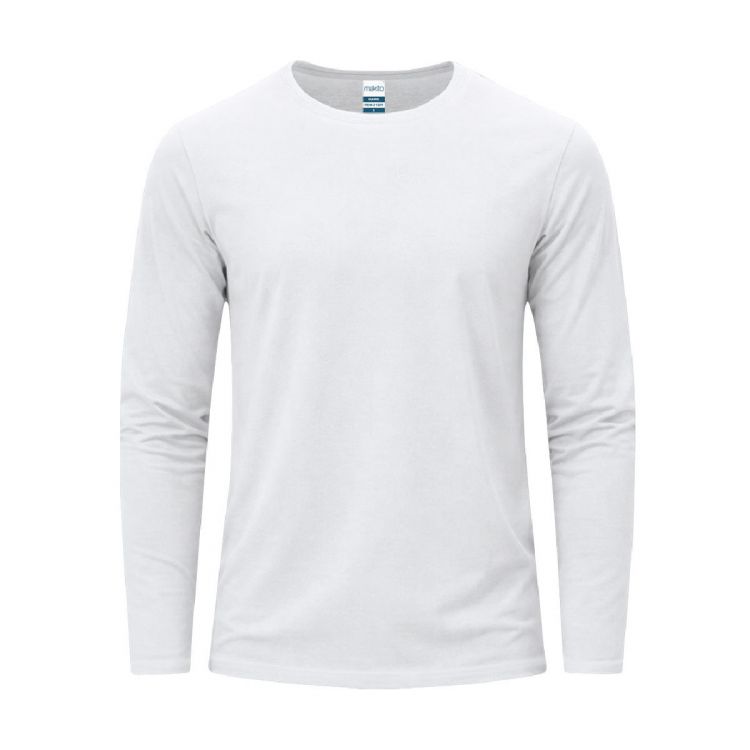 Maglietta a maniche lunghe taglia adulto, di colore bianco, morbida e piacevole al tatto in jersey liscio 100% cotone, 160 g/m². Realizzata in tessuto tubolare, con collo rotondo in costina 1x1 e copertura di cucitura rinforzata coordinata in bianco.
