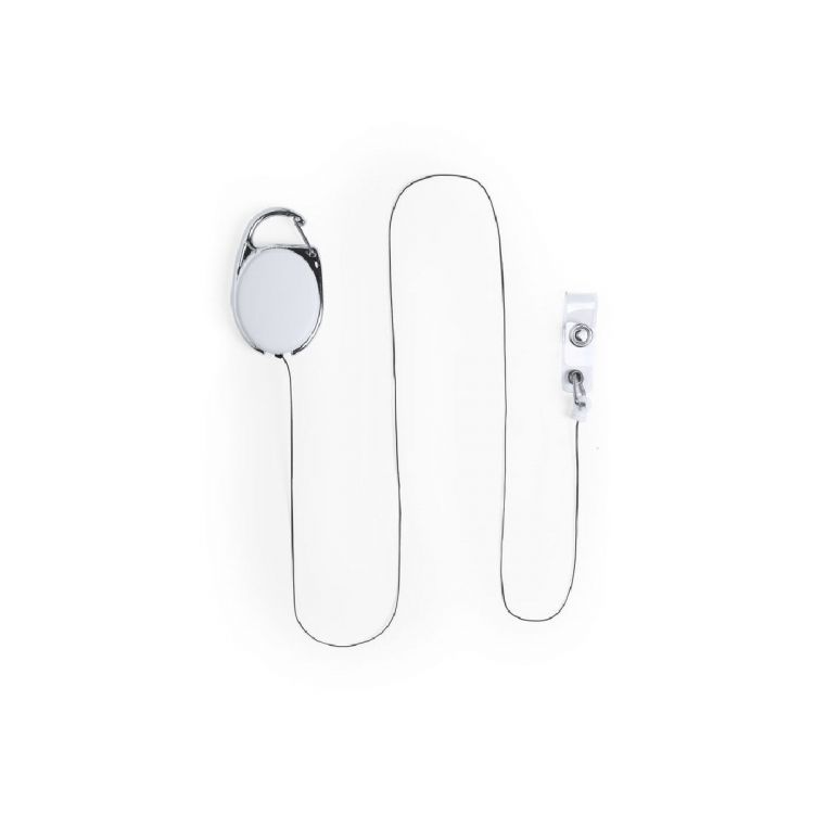 Porta badge estensibile dal design sobrio, con un accessorio di chiusura a bottone per appendere il badge e con un meccanismo allungabile fino a 75 cm. Con moschettone a gancio in metallo e ampia superficie di marcatura