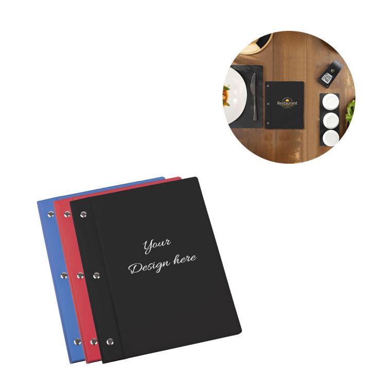 Porta menù medio a due ante realizzato esternamente in PVC cartonato e all'interno in finta pelle. L’articolo ha una costa larga che comprende 3 fori predisposti per le viti di montaggio a vista, fornite smontate, e comprende 10 buste in PPL con bucatura universale (smontate)