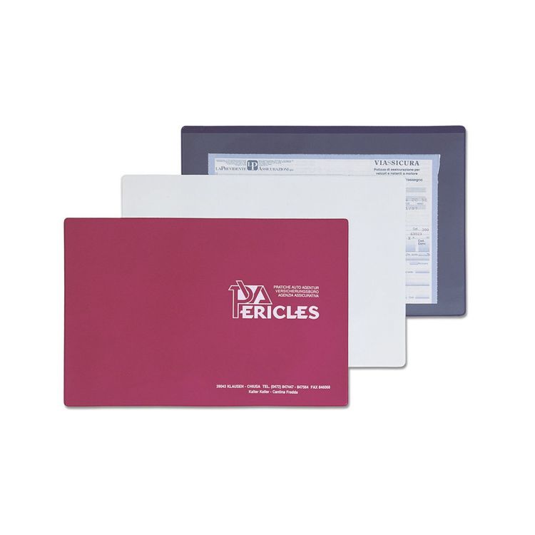 Busta porta polizza con un lato in similpelle e l’altro in PVC trasparente, apertura sul lato lungo per inserire i documenti.
