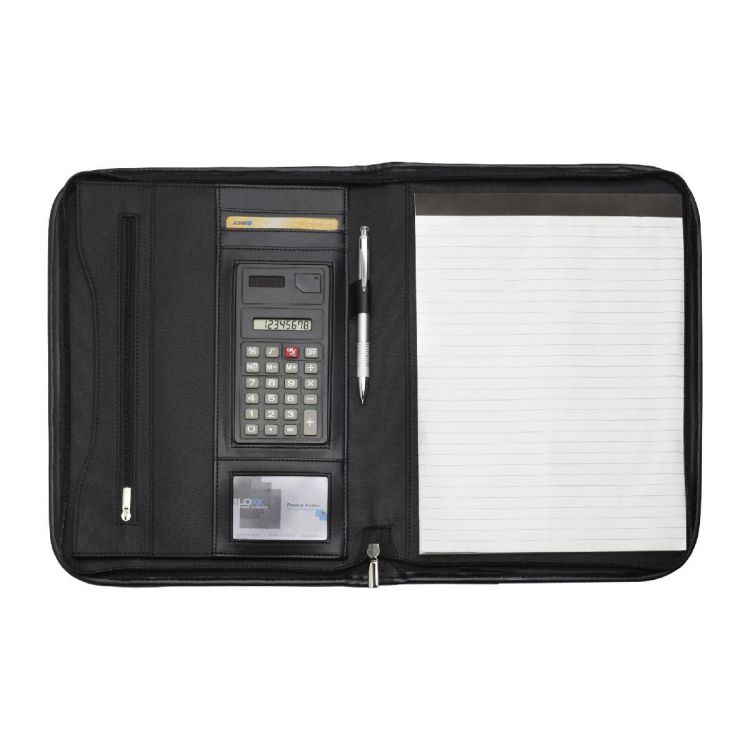 Portablocco formato +/- A4, maniglie retrattili, pannello interno attrezzato, vari scomparti, calcolatrice 8 cifre a doppia alimentazione, vano trasparente, chiusura lampo, passante porta penna, blocco incluso, in microfibra, in colore nero