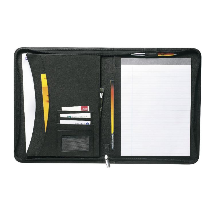 Portablocco formato +/- A4, chiusura a lampo, targhetta in metallo, blocco da 30 pagine a righe incluso, passante per penna (non inclusa), vari scoparti, chiusura lampo, in similpelle, in colore nero