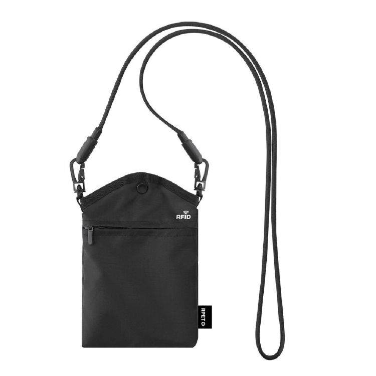 Custodia per matite fatta di RPET. Scomparto principale con chiusura a bottoni e tasca anteriore con sistema di chiusura a cerniera. Include un sistema di protezione RFID, progettato per bloccare l'accesso non autorizzato alle carte contactless. Cinghia di trasporto 2 in 1 fissata da moschettoni con funzione cavo adatta al trasferimento dati, con connessione di Tipo C da 60W. Include RFID e logo RPET. (colore nero)