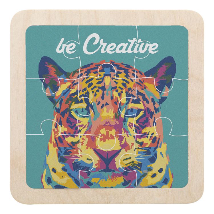 Puzzle in plastica da 9 pz con grafica personalizzabile su supporto in legno di betulla lamellare. Il prezzo include la stampa UV LED. Quantità minima: 100 pezzi