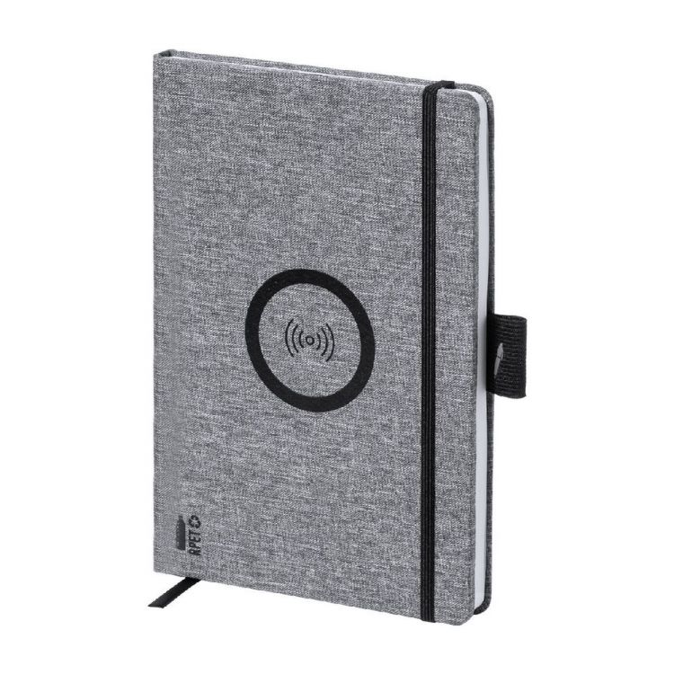 Quaderno con copertina in poliestere RPET, caricatore veloce wireless incorporato (10W) e 80 fogli a righe. Formato A5. Incluso cavo di ricarica USB. Poliestere 300D RPET, in colore grigio