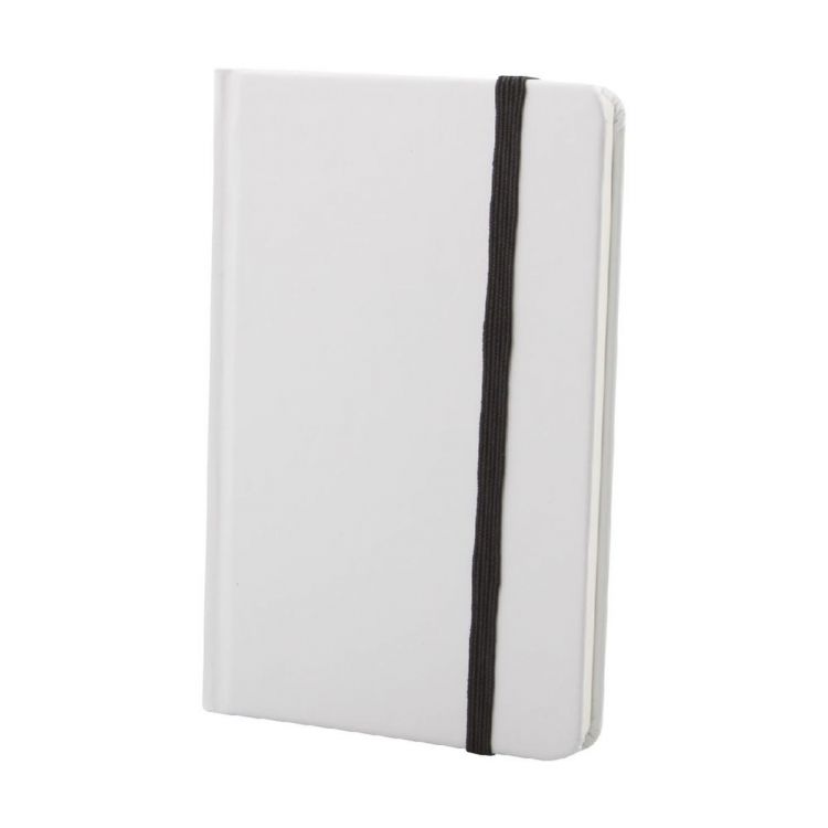 Quaderno con copertina in cartoncino da 80 fogli bianchi ed elastico chiusura colorato. Formato A6.